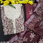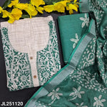 Light beige premium linen unstitched salwar material, embroidered on yoke(lining needed)bluish grey batik dyed bagalpuri jute silk cotton bottom, batik dyed pagalpuri jute silk cotton dupatta with hand embroidered. CODE JL251121