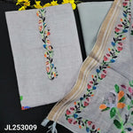 Light beige printed premium linen unstitched salwar material, hand embroidered on yoke& front(thin, lining needed)matching spun cotton bottom, digital printed semi linen dupatta with thin gold tissue borders. CODE JL253008