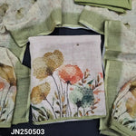 Light beige printed pure linen unstitched salwar material, bead &sequins work on yoke& daman(thin, lining needed)light peach pure cotton bottom, digital printed pure linen dupatta. CODE JN250502