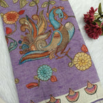 CODE NS138 : Light beige pure linen saree(thin &light weight)patch work, tissue border& lace work all over, pastel pink with rich applique work on pallu, striped pure linen running blouse with tissue borders.