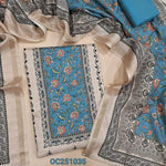 Light Beige fancy semi gicha unstitched salwar material(textured, lining needed)printed all over, dark peachish pink floral printed on yoke, dark peachish pink cotton bottom, floral printed semi gicha dupatta. OC251032