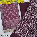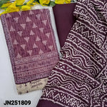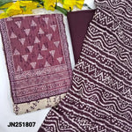 Beige base warli printed jute cotton unstitched salwar material, digital printed yoke patch with thread& sequins work(lining optional)purple cotton bottom, printed fancy art silk dupatta(REQUIRES TAPINGS). CODE JN251808