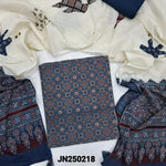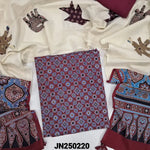 Black base ajrak hand block printed pure cotton unstitched salwar material(lining needed)matching cotton bottom, pure mul cotton full length dupatta with hand applique work. CODE JN250217