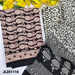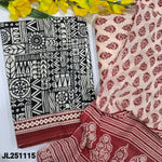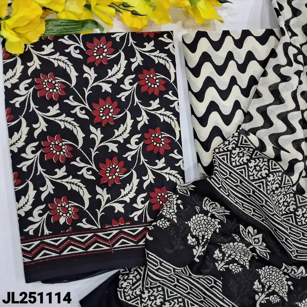 Black base printed pure cotton unstitched salwar material(lining optional)printed cotton bottom, printed pure mul cotton dupatta(REQUIRES TAPINGS). CODE JL251114