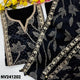 Black designer pure dola silk unstitched salwar material, gajji silk yoke patch with heavy work (shiny fabric, lining needed) matching santoon bottom, printed pure gajji silk dupatta with scallop edges. CODE NV241202