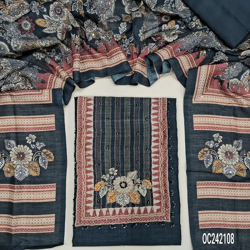 Digital printed Black Premium tussar silk unstitched salwar material(thin, lining needed) embroidery work on yoke, matching santoon bottom, digital floral printed, sequence work on tussar silk dupatta. Oc252108