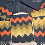 Black fancy semi tussar unstitched salwar material (lining needed) yellow zigzag printed daman, or yoke, matching silky bottom, zigzag printed fancy semi tussar full length dupatta with tassels. DC251025