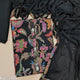 Black silk cotton unstitched salwar material (Lining optional) multicolor floral print all over, simple yoke, matching spun cotton bottom, sequins work on fancy chiffon dupatta with tapings. NV252909