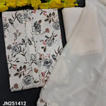 Black base floral printed satin cotton unstitched salwar material, real mirror work on yoke(lining needed)matching spun cotton bottom, embroidered fancy chiffon dupatta with tapings. CODE JN251411