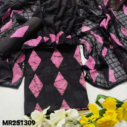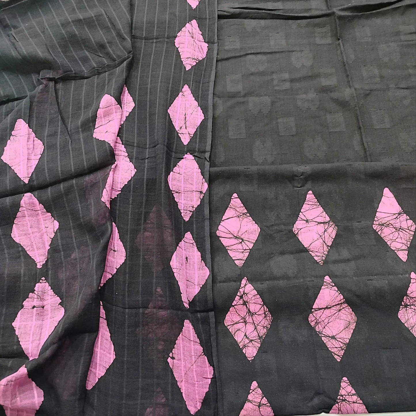 Black premium jakard cotton unstitched salwar material, batik dyed design on yoke(lining needed)batik dyed pure cotton bottom, batik dyed pure mul cotton full length dupatta with tapings. CODE MR251309