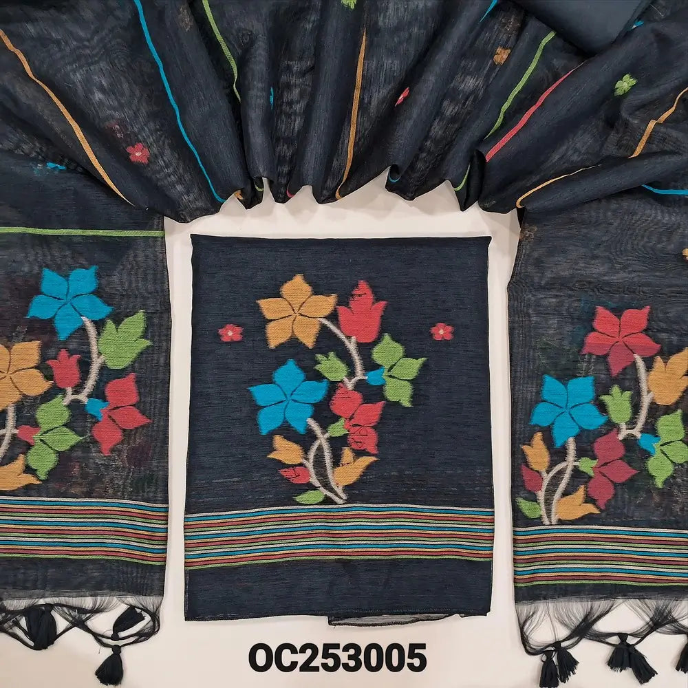 Black jamdani woven premium tussar silk unstitched salwar material, (Thin, textured, lining needed) gold and silver zari weaving on daman, silk cotton bottom, full length jamdani woven tussar silk dupatta. OC253005