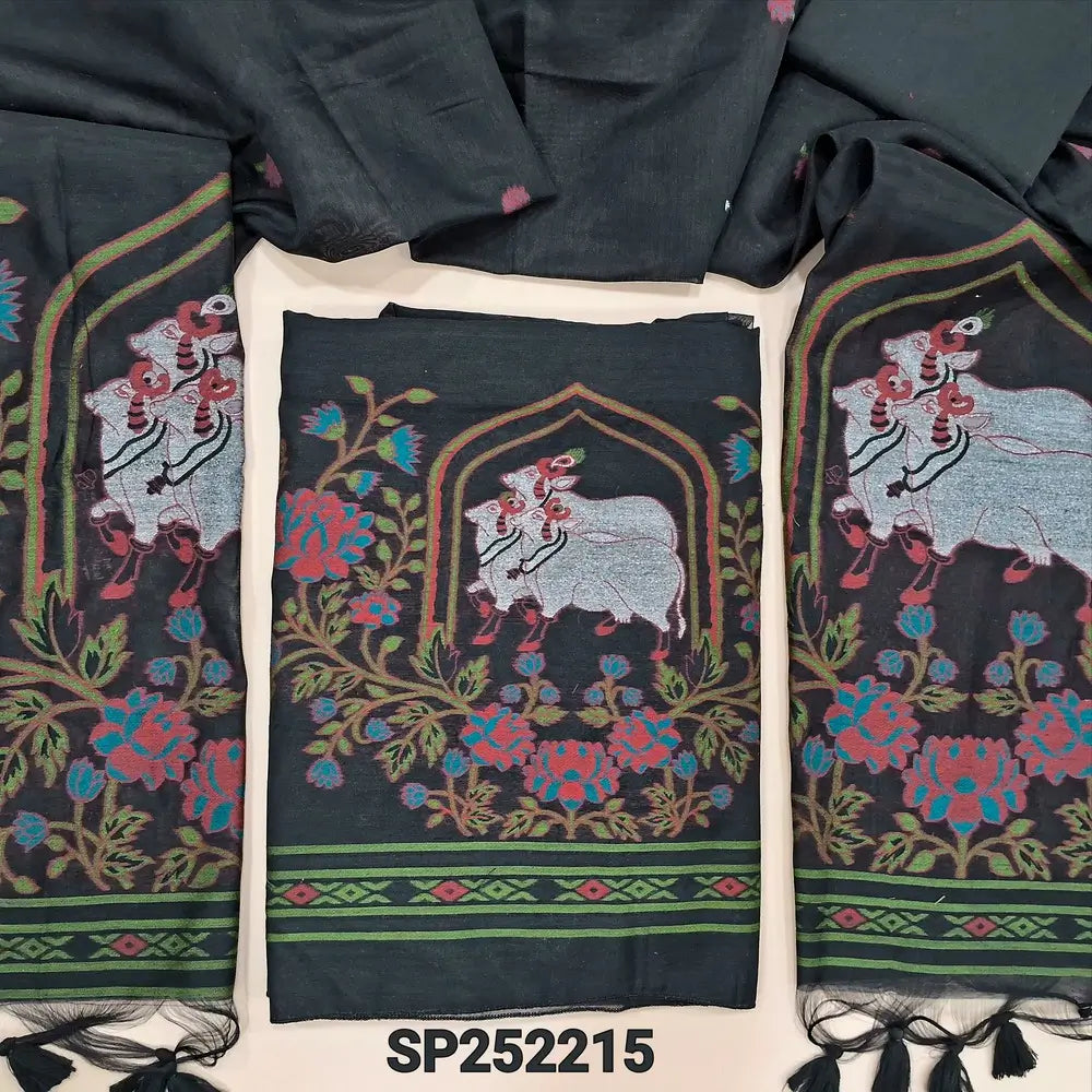 Black jamdani woven premium silk cotton unstitched salwar material, pichwai weaving on daman (Thin, Lining Needed) Matching Silk Cotton Bottom, jamdani woven full length dupatta with handamde tassels. SP252215