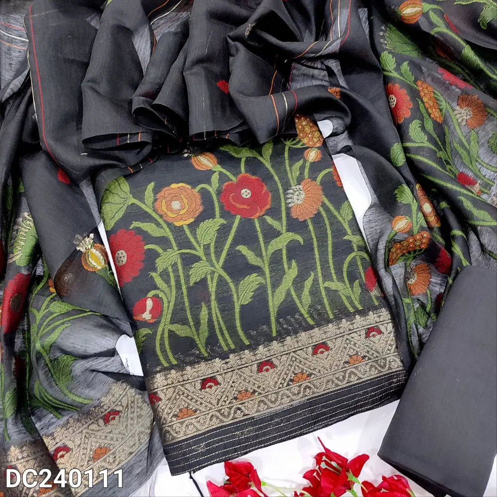 Black jamdani woven premium silk cotton unstitched salwar material(thin fabric, lining needed)zari woven daman border, matching premium cotton bottom, jamdani woven premium soft silk cotton dupatta with rich zari border. CODE DC240111