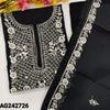 Black premium kota unstitched salwar material, hand embroidered with panel pattern on front(netted fabric, lining needed)matching santoon bottom, embroidered premium kota dupatta with pompom tapings. CODE AG242727