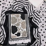 Black base polka printed pure maslin silk semi stitched salwar material, floral printed yoke with sequins work(silky, lining needed)matching spun cotton bottom, printed pure maslin silk dupatta with lace tapings. CODE JN250426