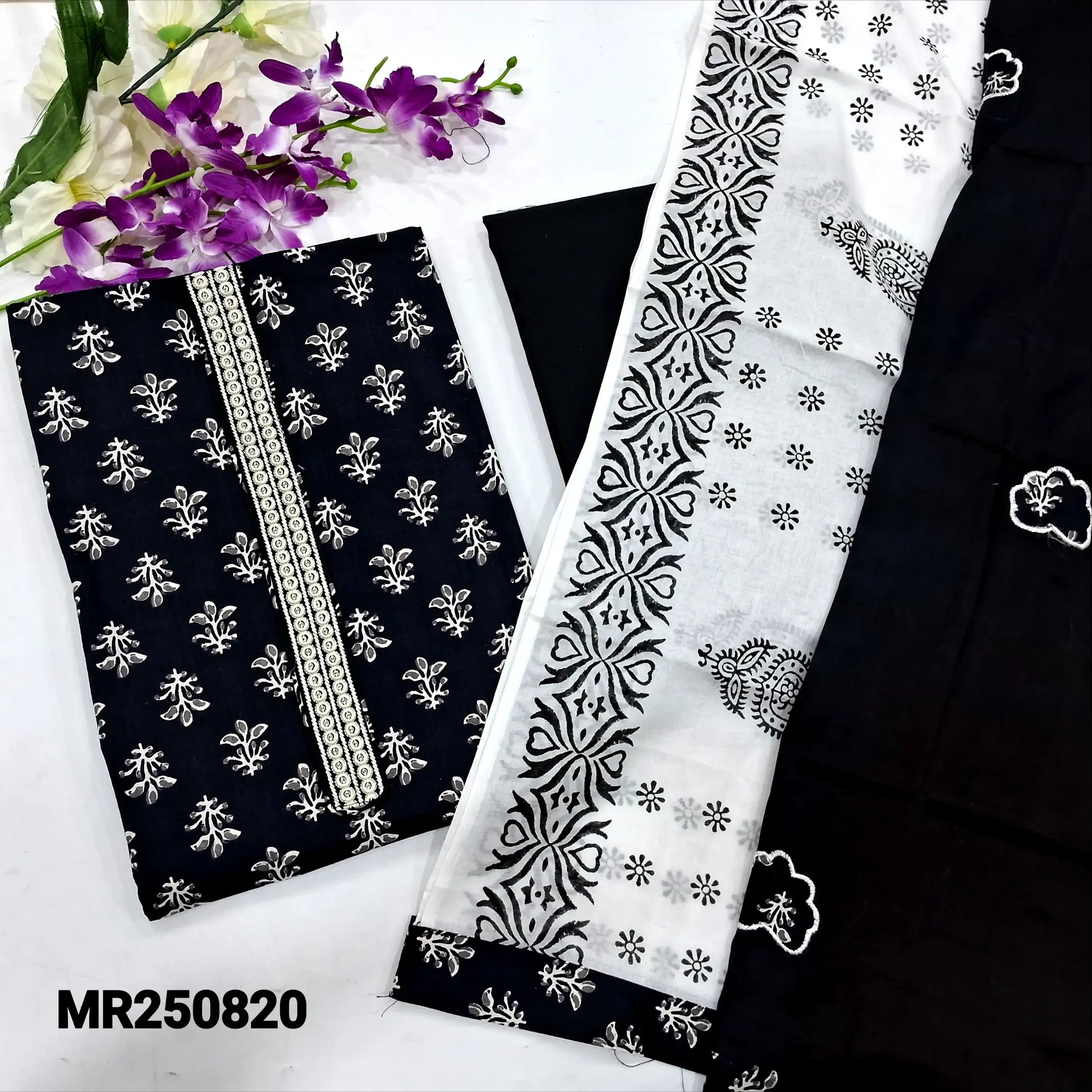 Black base printed pure cotton unstitched salwar material, thread& sequins work on yoke(lining optional)black cotton bottom, white, black& navy blue block printed pure cotton dupatta with applique work. CODE MR250820