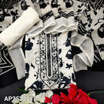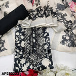 Black base printed semi linen unstitched salwar material, embroidered on yoke(lining needed)matching lining provided, NO BOTTOM, floral printed semi linen dupatta. Code AP252222