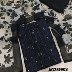Black printed semi tussar unstitched salwar material, embroidered& sequins work on yoke(lining needed)matching silky bottom, printed semi tussar dupatta CODE AG250904