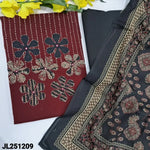Black pure cotton unstitched salwar material, applique, thread& faux mirror work on yoke(lining optional)maroon cotton bottom, ajrak printed pure mul cotton full length dupatta. CODE JL251208