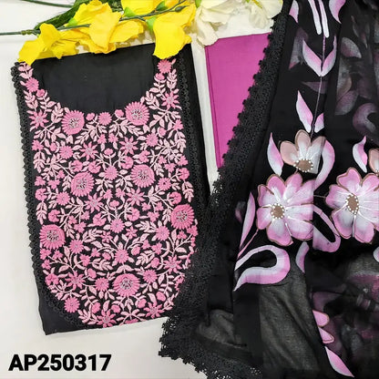 Black self embroidered pure jakard cotton unstitched salwar material, embroidered on yoke(lining needed)purple cotton bottom, brush painted fancy chiffon dupatta with lace tapings. CODE AP250317