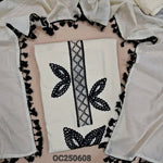 Black liquid fabric unstitched salwar material, real mirror, lace floral design on front (Lining Needed) matching bottom, soft silk cotton dupatta with crochet work and tapings. OC250607