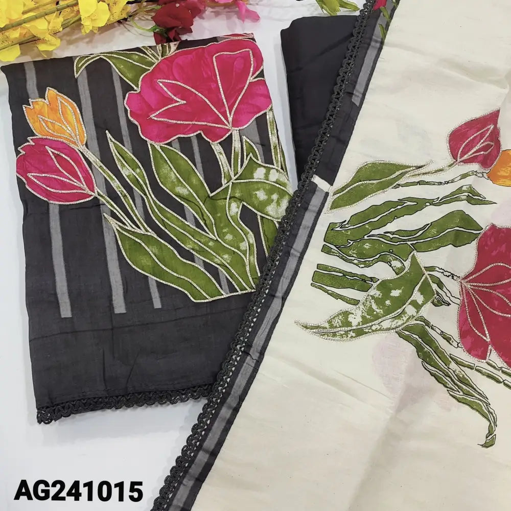 Black vertical printed satin cotton unstitched salwar material(lining optional) bright floral print with zari work on daman, matching spun cotton bottom, pure cotton dupatta with floral print, zari work& lace tapings. CODE AG241015