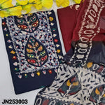 Black original wax batik dyed modal cotton unstitched salwar material, zari& faux mirror work on yoke(lining needed)dark maroon batik dyed modal cotton bottom, dual shaded batik dyed pure chiffon dupatta(REQUIRES TAPINGS). CODE JN253004