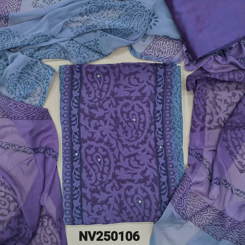 Light Blue & dark purple block printed semi georgette unstitched salwar material,(flowy, lining needed) faux mirror work on front, silk cotton bottom, block printed dual shaded fancy chiffon dupatta. NV250106