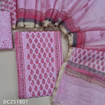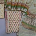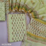 Pastel Green block printed chikankari embroidered mul cotton unstitched salwar material, panel pattern on front(lining needed)block printed cotton bottom, block printed kota cotton dupatta with gold tissue border. DC251808