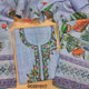 Powder blue premium linen unstitched salwar material(textured, lining needed) rich hand embroidery work on front, matching santoon bottom, digital floral printed, hand embroidery work on linen dupatta. OC251017