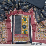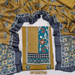 Blue printed satin cotton unstitched salwar material, faux mirror work on yoke(lining optional)matching spun cotton bottom, printed pure mul cotton dupatta. CODE SP250710