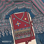 Dark blue pure kantha cotton unstitched salwar material, angraha neck with real mirror, thread& tassels(lining optional)printed pure cotton bottom, printed pure mul cotton dupatta(REQUIRES TAPINGS). CODE AG252111