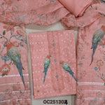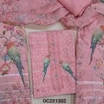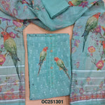 Pastel blue slub organza unstitched salwar material,(thin, lining needed) digital printed, sequence work on yoke and daman, matching santoon bottom, digital printed slub organza dupatta with lace borders. OC251301