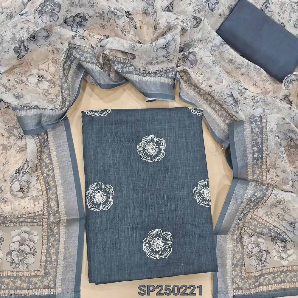 Bluish grey semi linen unstitched salwar material, embroidery on front(lining needed)matching santoon bottom, printed semi linen dupatta. CODE SP250221