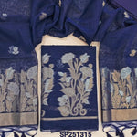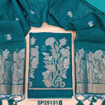 Bottle Green jamdani woven premium tussar silk unstitched salwar material, (Thin, textured, lining needed) gold and silver zari weaving on daman, silk cotton bottom, full length jamdani woven tussar silk dupatta. SP251316