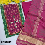 Brown ikat woven pure cotton unstitched salwar material, real mirror work on yoke(lining optional)teal blue spun cotton bottom, hand block printed fancy silk cotton dupatta with gold tissue pallu. CODE JL251408