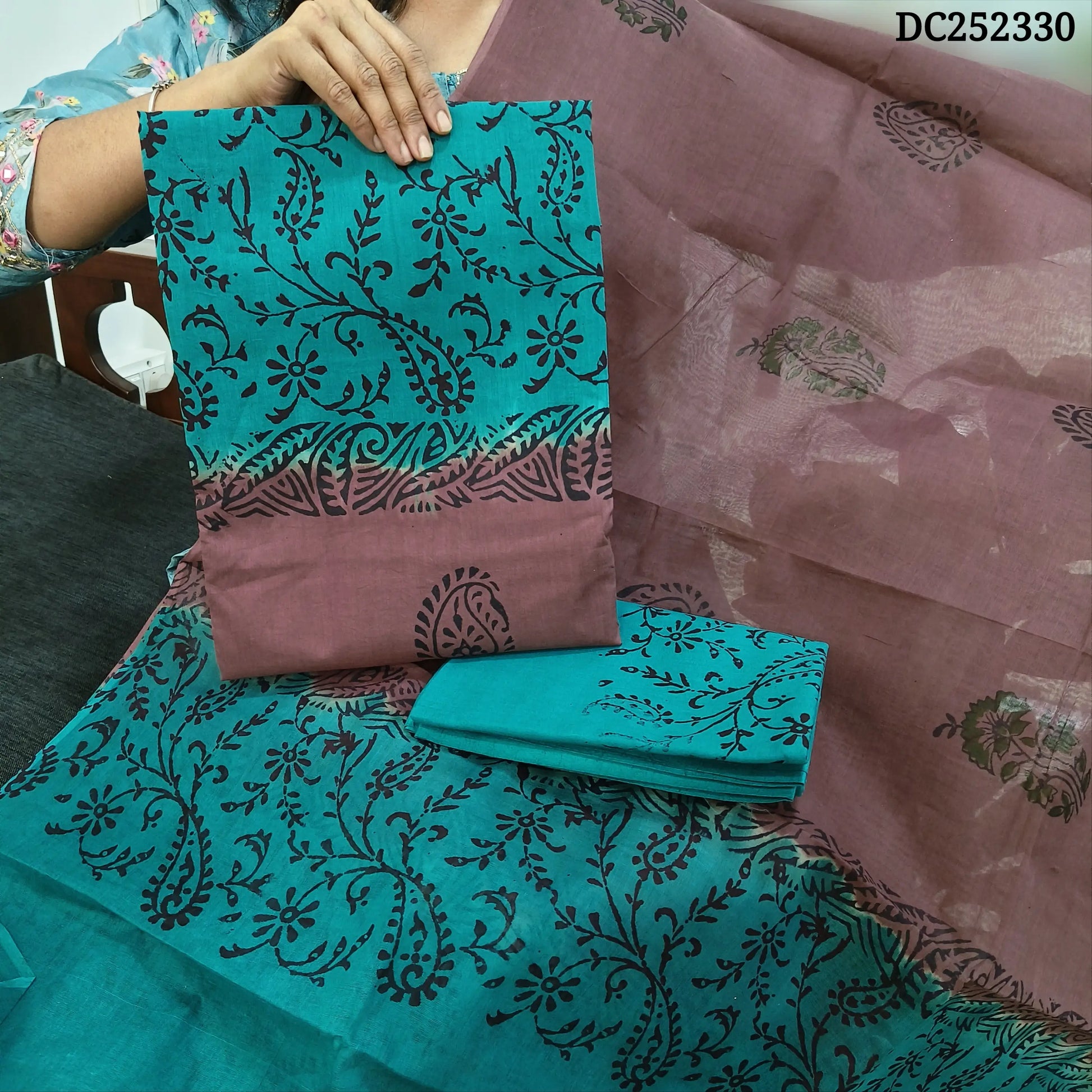 Brown & turquoise green pure cotton unstitched salwar material (lining needed) hand block printed allover, printed cotton bottom, block printed dual shade dupatta. DC252330 (over lapping of prints not consider as a defect)