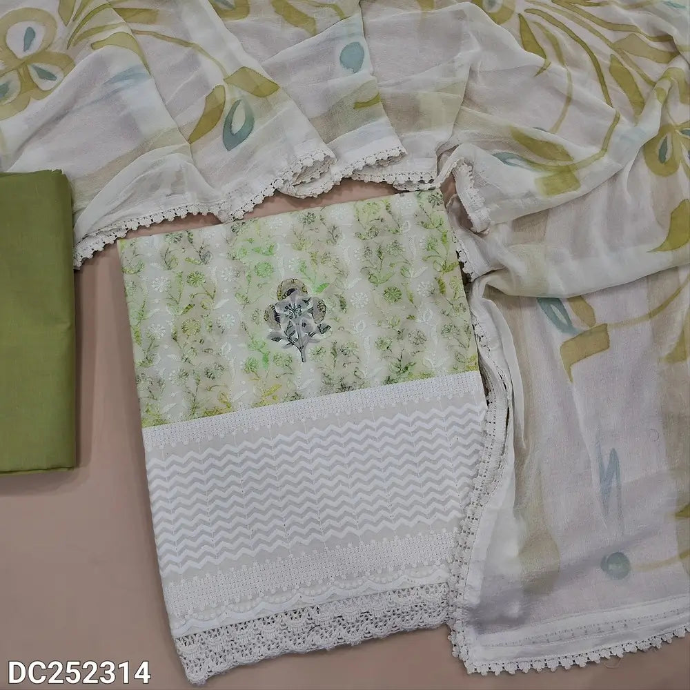 Half White glazed cotton unstitched salwar material (lining needed) chikankari embroidery work on front, daman design, light Green cotton bottom, brush paint work on chiffon dupatta with lace tapings. DC252314