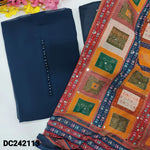 Dark green semi georgette unstitched salwar material, potli buttons on yoke(lining needed)matching silky fabric provided for both bottom& lining, abstract printed semi georgette dupatta with real mirror work. CODE DC242114