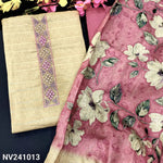 Beige sobar printed semi gicha unstitched salwar material, embroidered& real mirror work on yoke, self weaving design all over(lining needed)yellowish beige santoon bottom, floral printed semi gicha dupatta with gold tissue borders. CODE NV241015