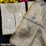 Golden beige tissue kota unstitched salwar material, heavy embroidered on yoke, panel pattern embroidered on front(netted fabric, lining needed)matching silky bottom, embroidered tissue kota dupatta with tassels. CODE NV241503