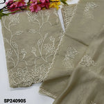 Sandal yellow embroidered organza unstitched salwar material(thin, lining needed)cut work edges on daman, matching santoon bottom, embroidered organza dupatta with cut work edges. CODE SP240903