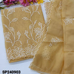 Greyish beige embroidered organza unstitched salwar material(thin fabric, lining needed)cut work edges on daman, matching santoon bottom, embroidered organza dupatta with cut work edges. CODE SP240905