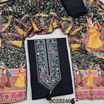 Dark Blue premium soft silk cotton unstitched salwar material,(lining optional) colorful embroidery work on yoke, matching spun cotton bottom, digital colorful printed crepe silk short width dupatta. OC252404