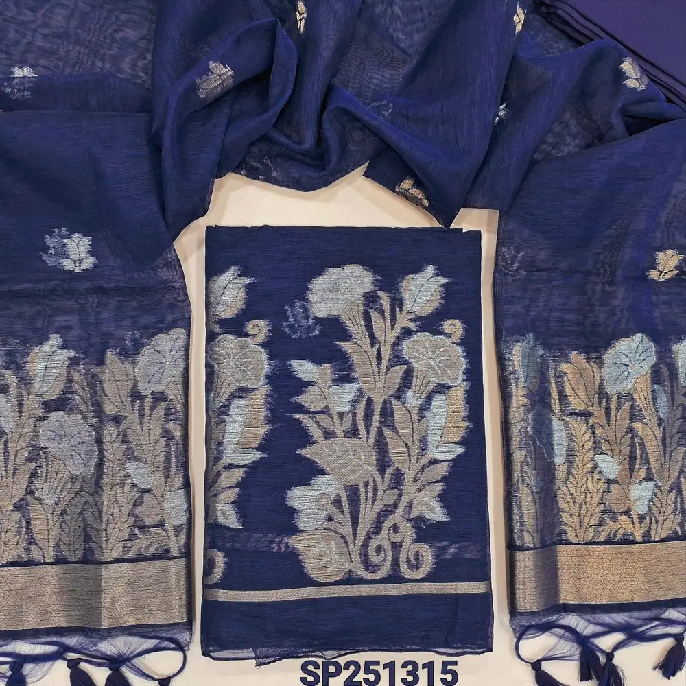 Dark Blue jamdani woven premium tussar silk unstitched salwar material, (Thin, textured, lining needed) gold and silver zari weaving on daman, silk cotton bottom, full length jamdani woven tussar silk dupatta. SP251315