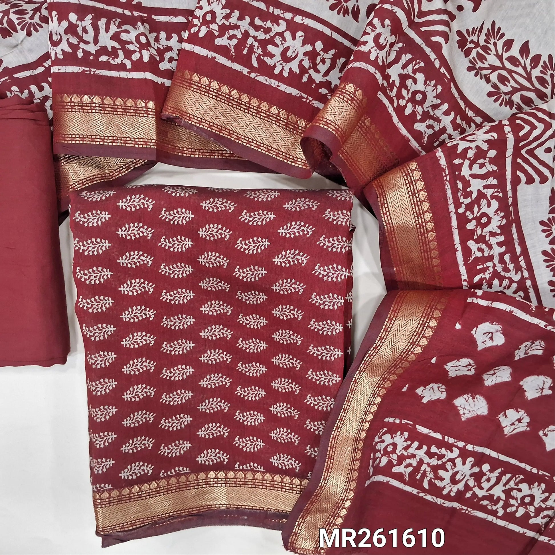 Dark maroon Printed soft silk cotton unstitched salwar material (lining needed) nizam borders on daman, matching spun cotton bottom, printed full length silk cotton dupatta with borders. MR261610