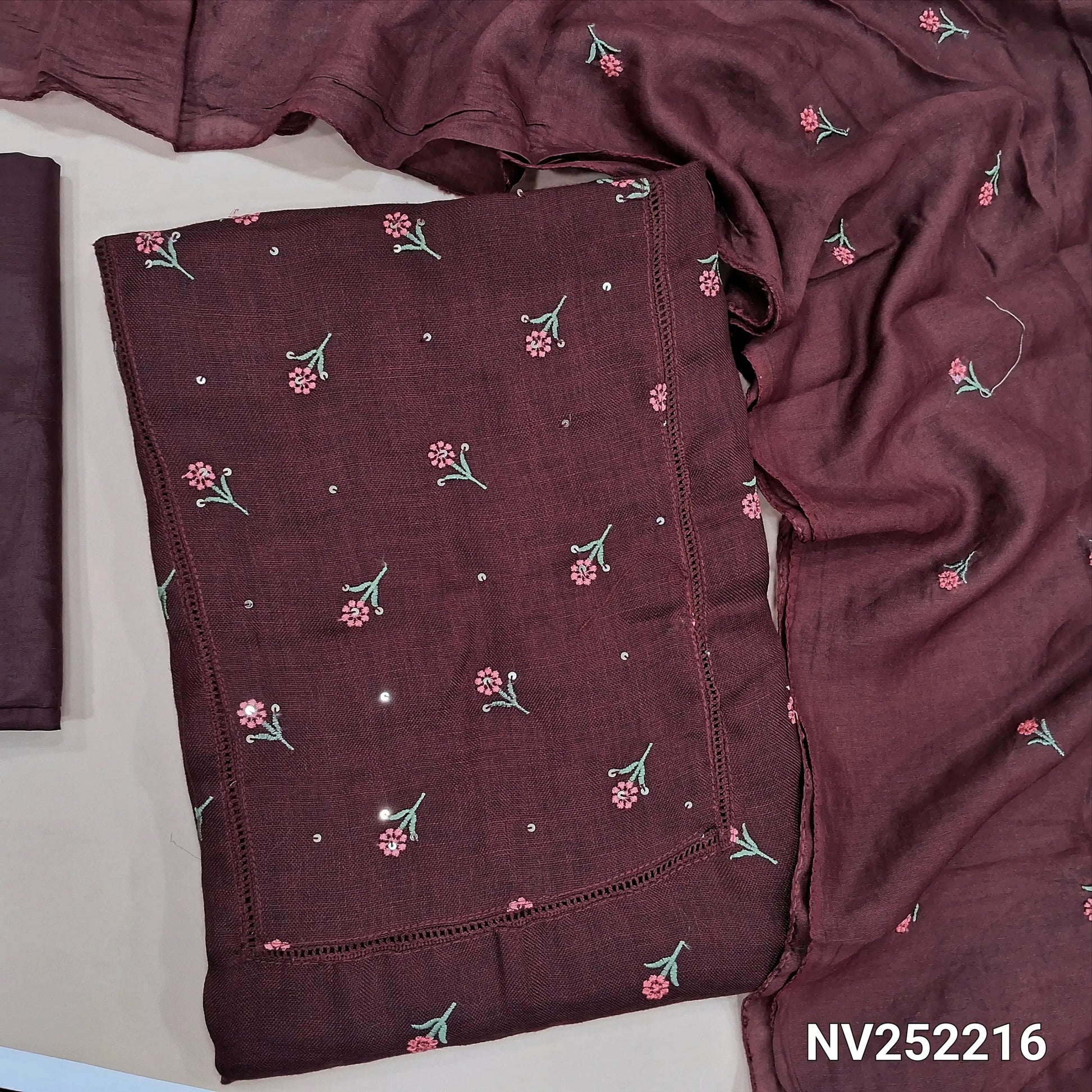 Dark maroon semi linen unstitched salwar material (textured,lining optional)crochet work on yoke, floral embroidery on front, matching silky bottom, embroidery work on fancy soft silk cotton dupatta. NV252216