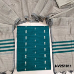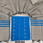 Dark Maroon Slub silk cotton unstitched salwar material, zari woven buttas all over (Weaving pattern might vary slightly, lining needed) beige silk cotton bottom, dupatta with striped pallu. NV251804