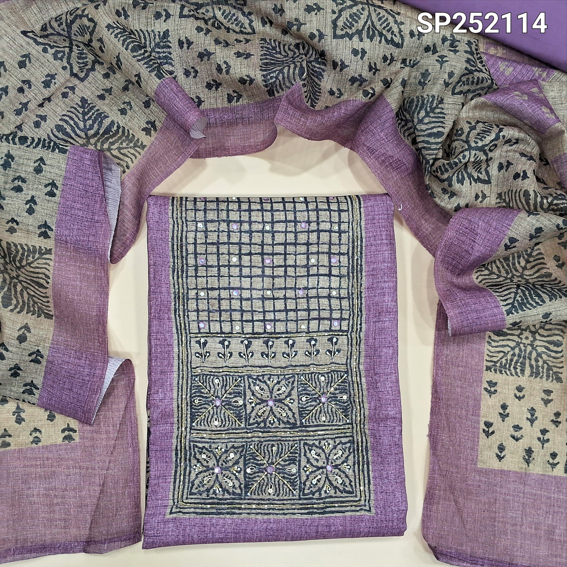 Light purple semi tussar unstitched salwar material, printed yoke patch with bead and embroidery detailing (Lightweight, Textured, Lining Needed) Matching santoon bottom, printed semi tussar dupatta. SP252114