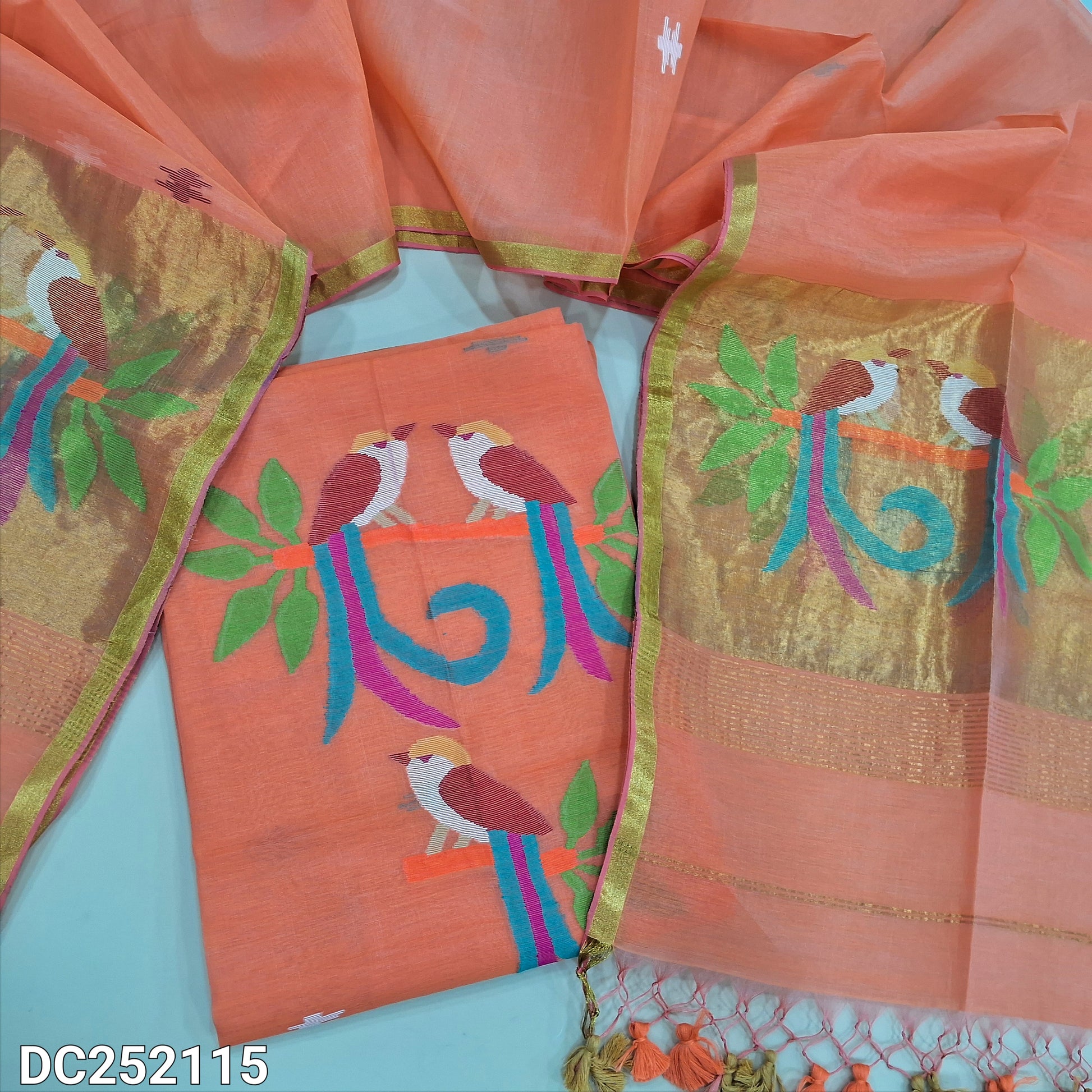 Dark Peach muslin jamdani unstitched salwar material, thread weaving on yoke& front(thin, lining needed)NO BOTTOM, muslin jamdani full length dupatta with gold tissue pallu& paithani weaving. DC252115